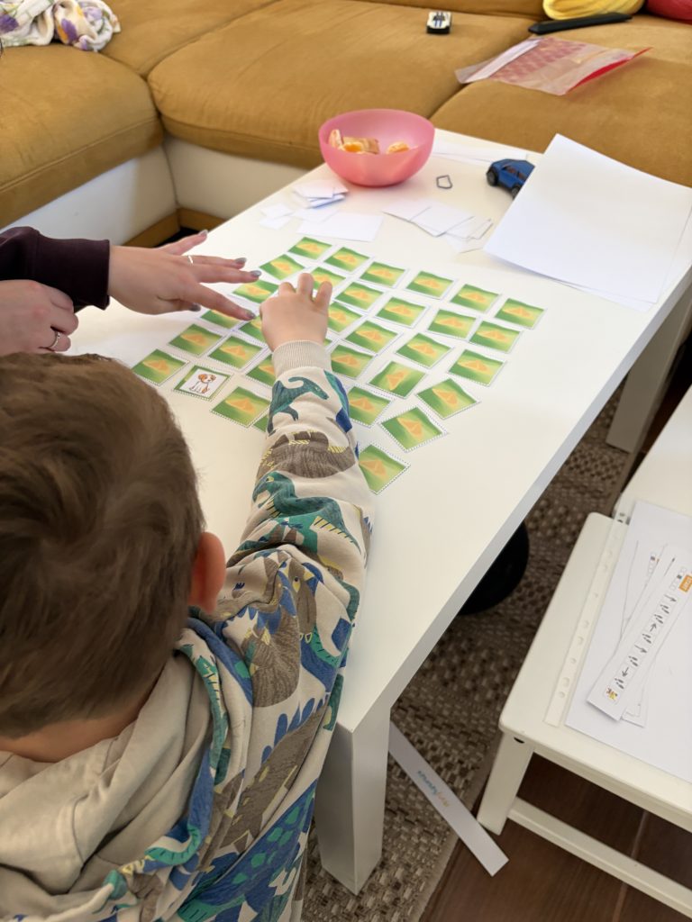 - Az első a klasszikus játékmenet volt, amikor a gyereknek kellett a kapott kódsor alapján megtalálni, hogy melyik kártya alatt rejtőzhet a csont. Vagy ha több csont is van, akkor sorban végig kellett menni a megfelelő mezőkön.